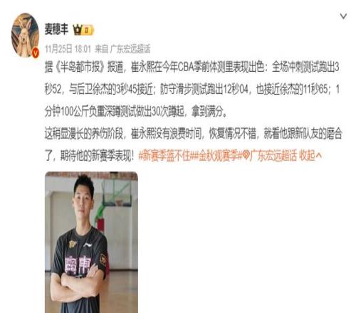 从目前爆料的一些数据能看出崔永熙的恢复状态非常好,CBA外线投篮测试,崔永熙25中16,比王睿泽还出色,徐杰26中21,郭艾伦是25中15。
