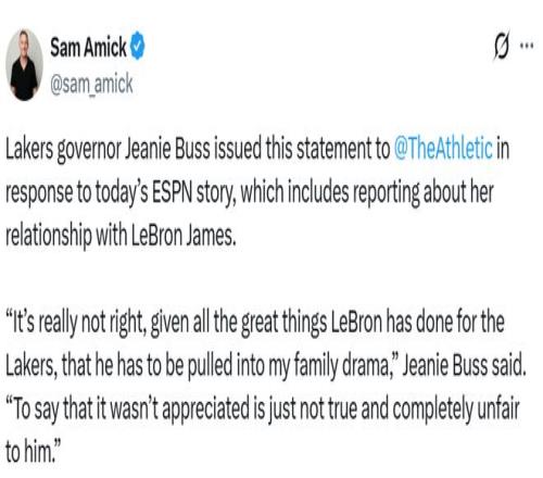 珍妮-巴斯就今日ESPN的相关报道,向The Athletic媒体发布声明,该报道中包含了关于她与詹姆斯关系的相关内容。珍妮表示:“勒布朗为湖人立下了汗马功劳,如今却被卷入我们的家族纷争,这实在太不应该了。说球队不感激他的付出,这绝非事实,对他而言也极度不公。”